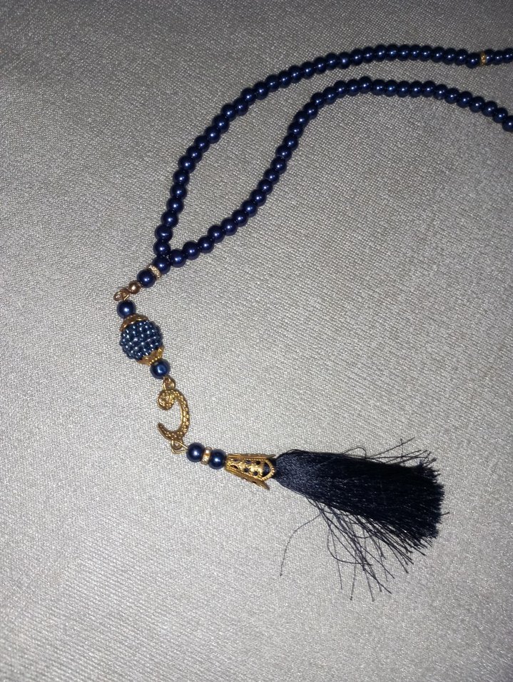 Lacivert tesbih, yuvarlak boncuklar, süslü boncuk ve siyah püskül ile bohem tarz sunar. ✨