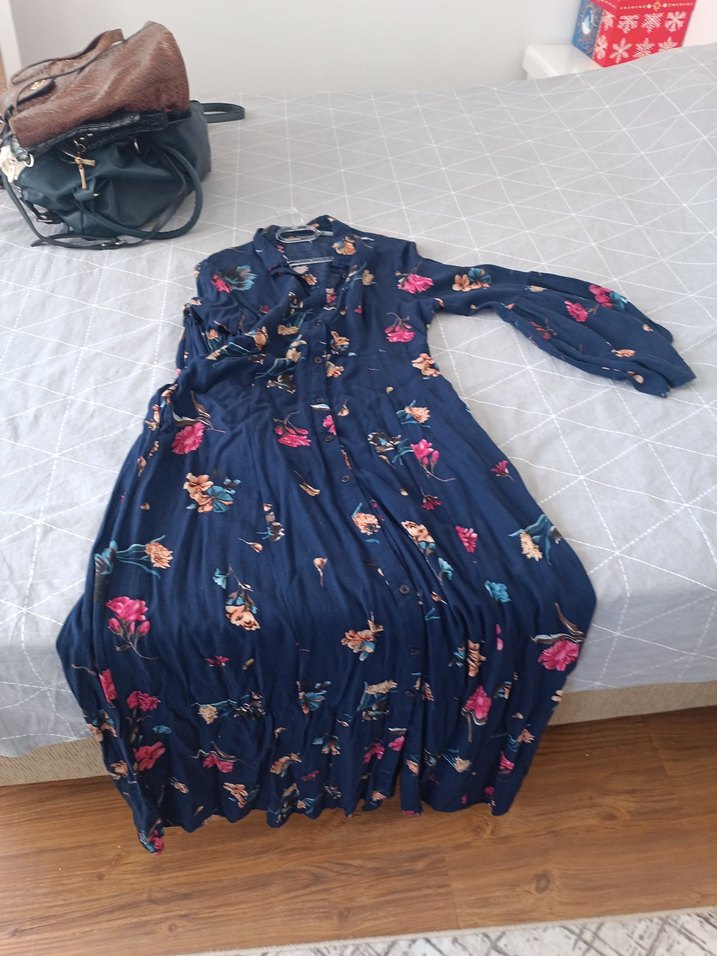 Lacivert uzun kollu, drapeli ve desenli bohem tarzında, bol kesim bir elbisedir. V yaka detayına sahiptir.