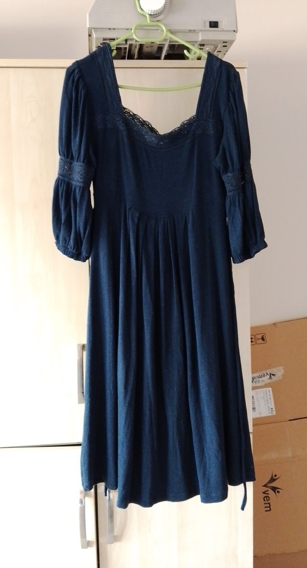 Lacivert midi uzunlukta, bol kesim, uzun kollu ve drapeli tasarıma sahip keten elbise. V yaka ve dantel detayları romantik akşamlar için uygun.