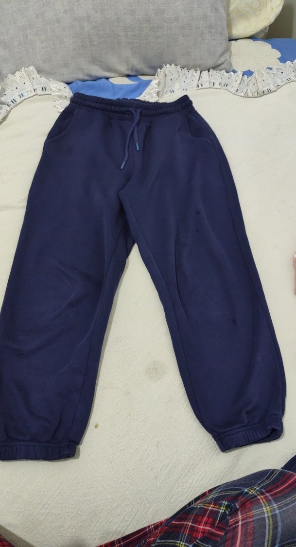 bol kesim ve koyu mavi renkte, yumuşak ve sıcak kumaştan yapılmış rahat eşofman altı. Elastik bel ve paçalar bulunur.