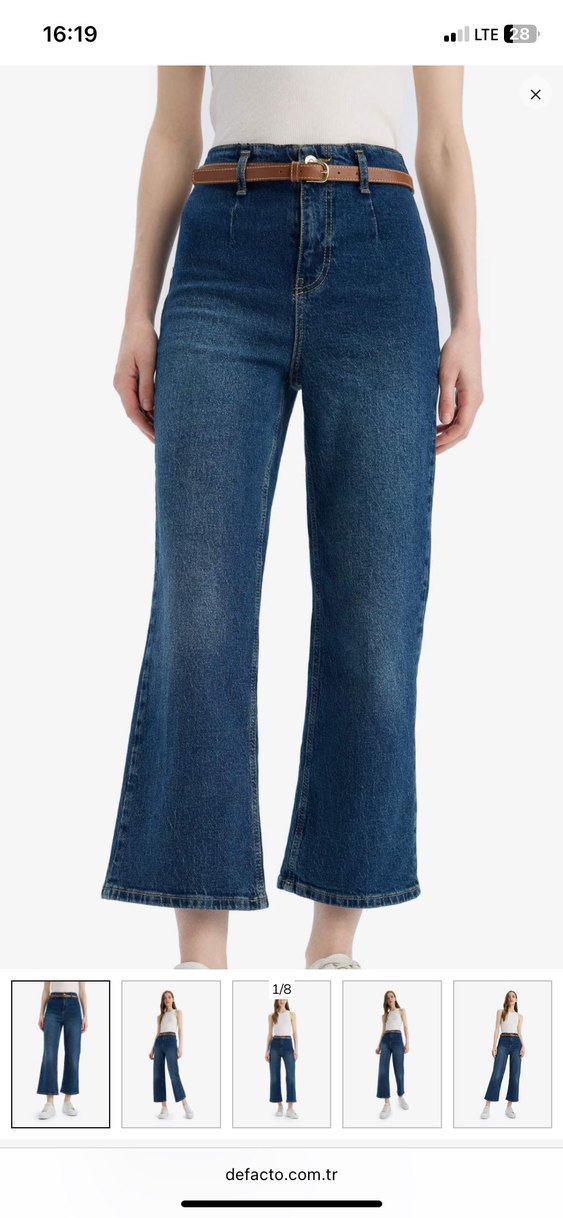 Lacivert renk, bol kesim ve midi boyda, desen içermeyen rahat ve şık kadın denim pantolon.