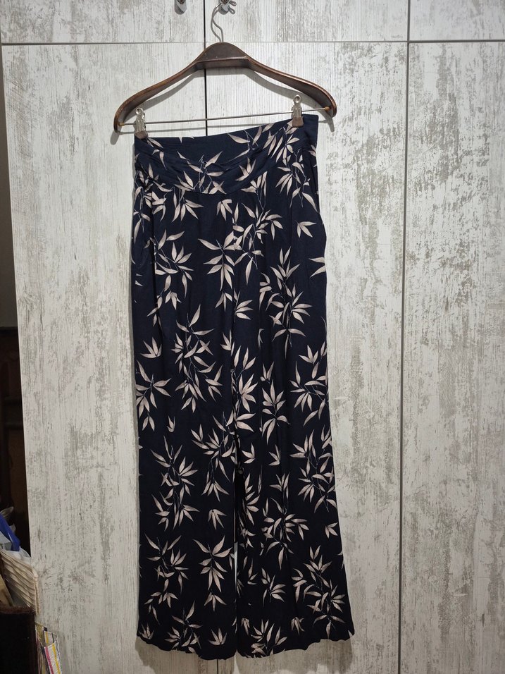 Lacivert, bol kesim, pileli ve koyu batik desenli uzun kadın pantolon, yumuşak sentetik kumaştan, günlük rahat kullanım için uygun.