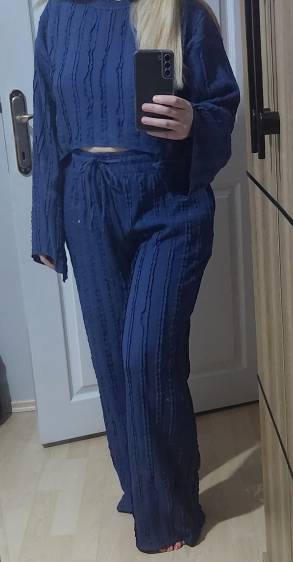 Lacivert, bol kesim, keten kumaştan, pile detaylı, midi boy kadın pantolon, günlük rahat stil için uygundur.