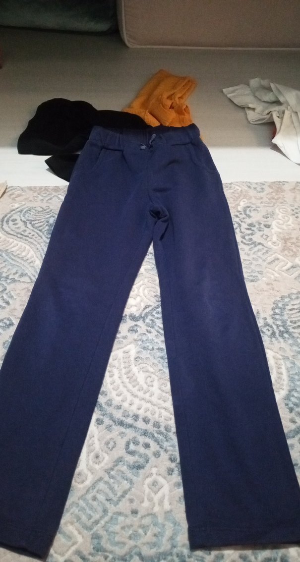 Lacivert renk, bol kesim, kemerli kadın kumaş Orta boy, yumuşak ve sıcak kumaştan, günlük kullanım için uygun.