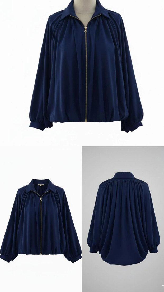 Bol kesim, drapeli lacivert yüksek yakalı ve uzun kolludur. penye kumaştan yapılmış, günlük kullanım için uygundur. fermuarlı kapamalıdır. ( kendim dikiyorum)