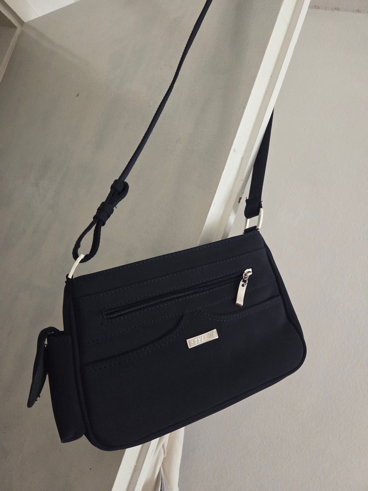 Siyah renkli, fermuarlı, sentetik kumaştan minimalist kadın çantası. Sokak stiline uygun, gündelik kullanım için ideal.