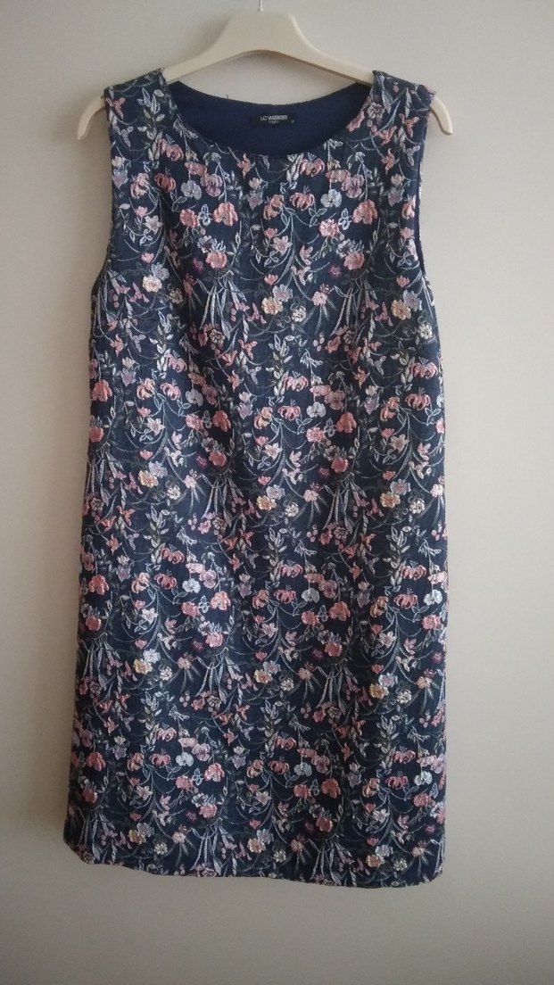 Yandan fermuarlı yuvarlak yakalı, astarlı çiçek desenli lacivert midi elbise, kolsuz ve normal kesimdir. Günlük kullanıma uygundur. Sağlam temiz yeni.