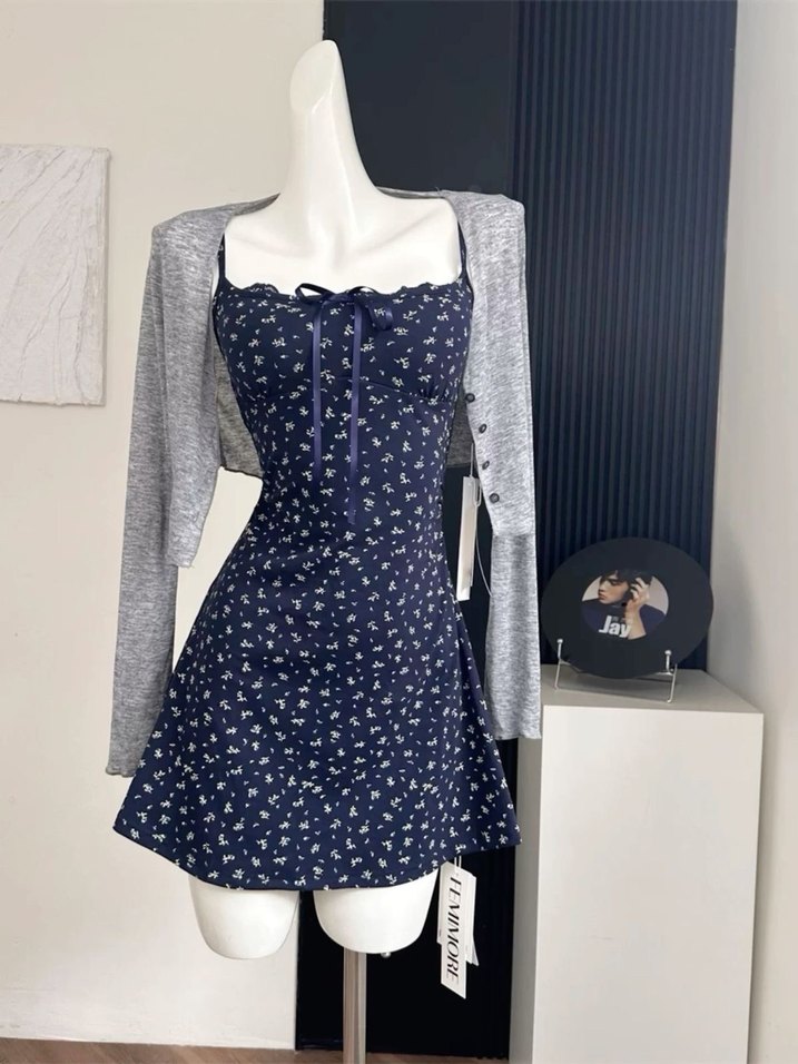 Lacivert Çiçek Desenli Elbise