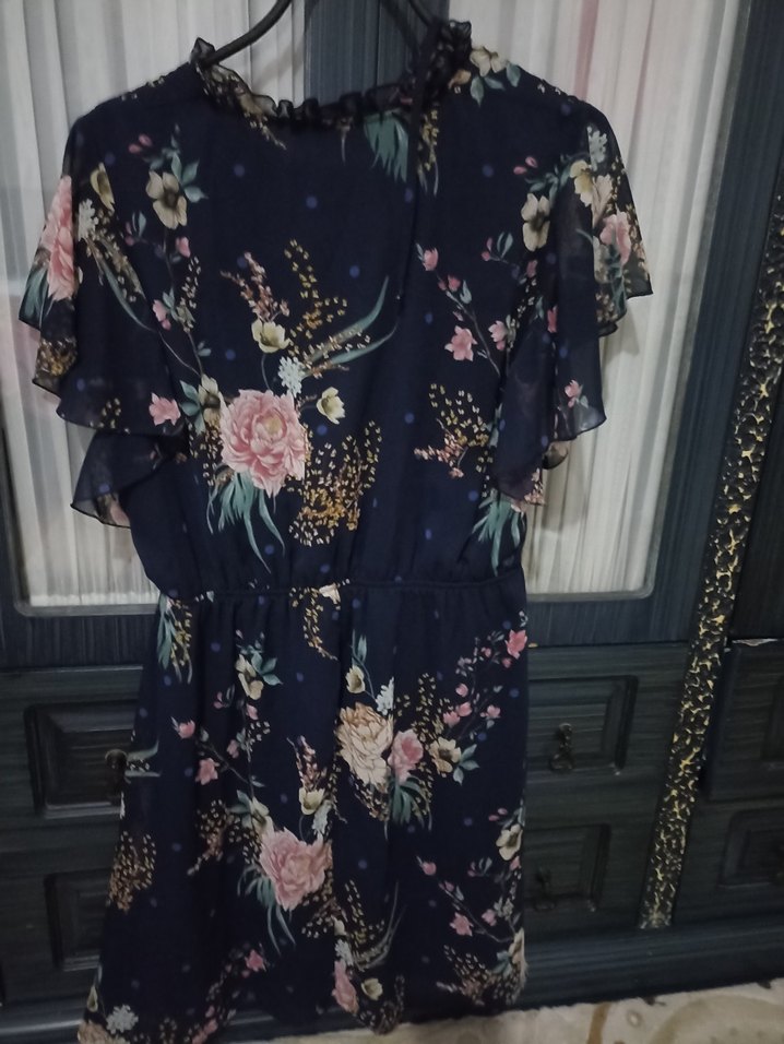 Lacivert renkte, çiçek desenli midi boy, kısa kollu, fırfırlı ve yüksek yakalı bohem tarzda rahat kesim elbise. Romantik akşamlar için uygundur.