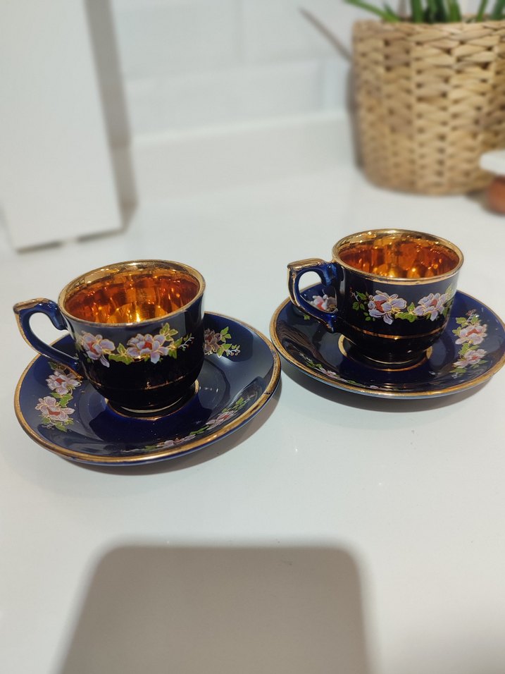 Lacivert renkli, çiçek desenli ve altın renkli iç kısmı olan 2'li fincan takımı ☕