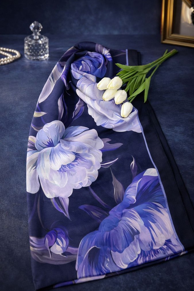 Lacivert renkte, ipek dokulu, büyük çiçek desenli ve drapeli bohem tarzda Parisian şal.