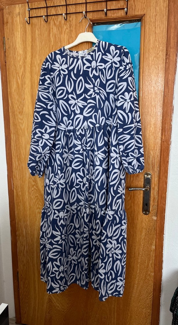 Lacivert renkte, çiçek desenli, bol kesim ve fırfırlı uzun elbise. Yumuşak sentetik kumaştan, bohem tarzda, günlük kullanıma uygun.