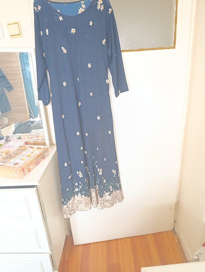 Lacivert renkli, çiçek desenli uzun ve bol kesim kapri kollu ve yuvarlak yaka esnek kumaş günluk elbisedir