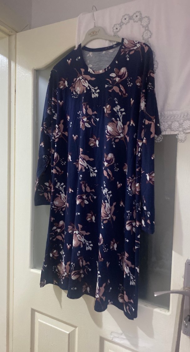 Lacivert renkli, uzun kollu, yüksek yakalı ve çiçek desenli rahat bol kesim ve uzun boyda tasarlanmıştır.