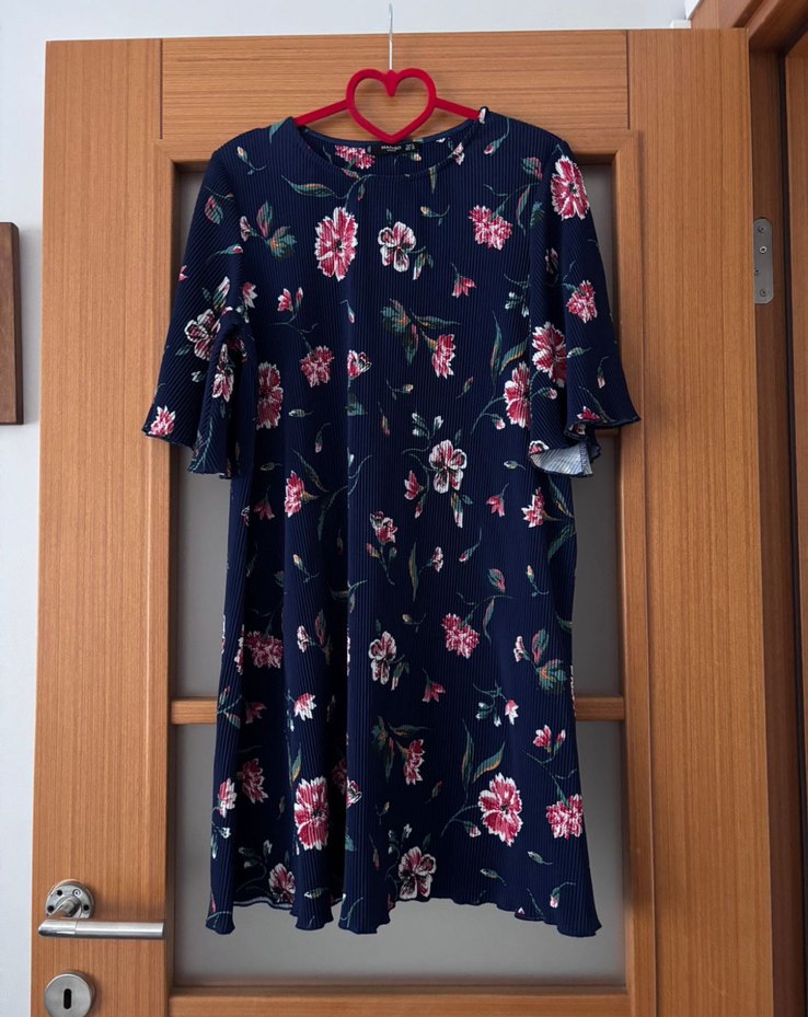 Lacivert midi boy, bol kesim kısa kollu elbise. Çiçek desenli, fırfır detaylı ve yumuşak sentetik kumaştan yapılmıştır. Romantik akşamlar için uygundur.
