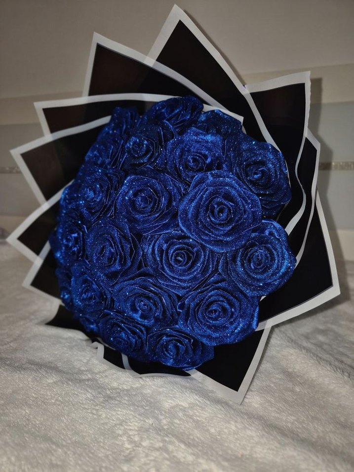 Koyu lacivert çiçek desenli, fırfırlı kadın broşu, düğünler ve gösterişli tarzlar için uygun.