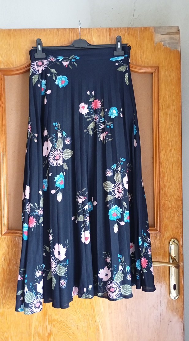 Lacivert pilili uzun etek, bol kesim ve çiçek desenlidir. Sentetik kumaştan yapılmış olup bohem tarz için uygundur.