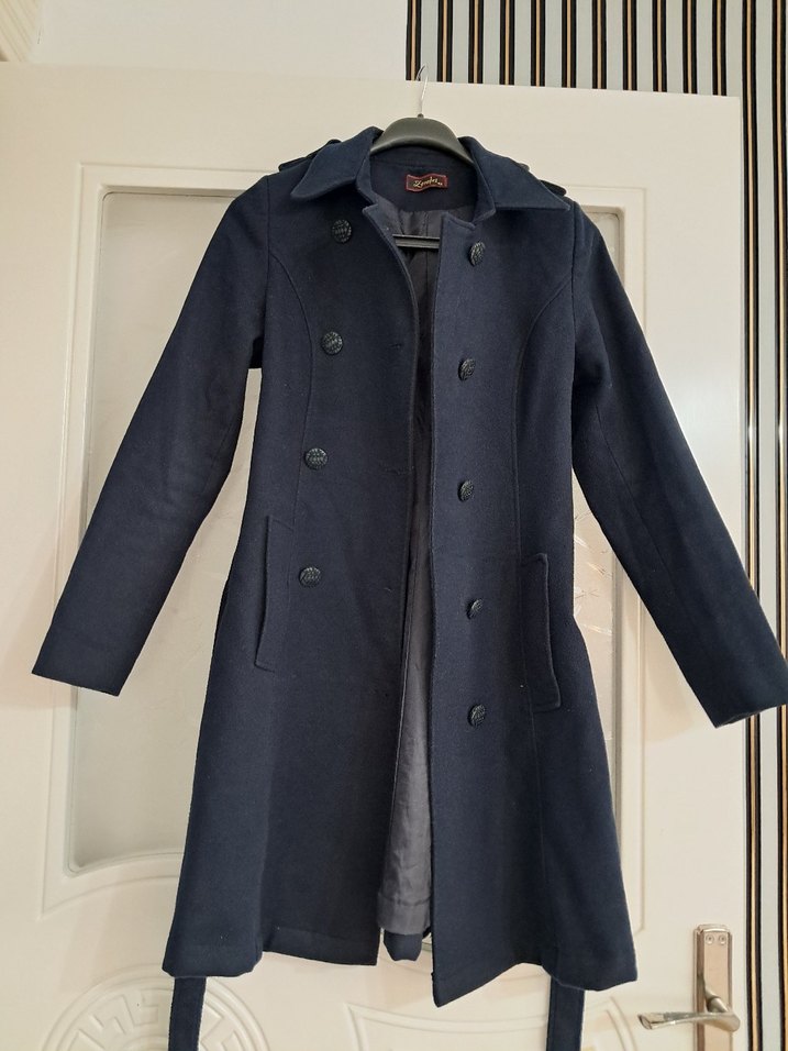 Lacivert renkte, çift düğmeli, midi boy ve yan cepli klasik kaban. kuşağı mevcut hiçbir yerinde bir sorun yok kullanmadığım için satıyorum kalıbı biraz dar.