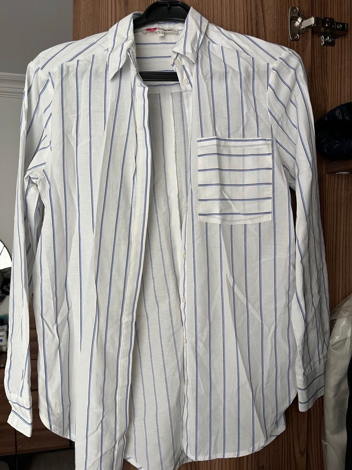 Lacivert çizgili, keten kumaştan, uzun kollu ve düğmeli, yakalı, rahat kesim gömlek. Cep detayıyla günlük sokak stiline uygundur.