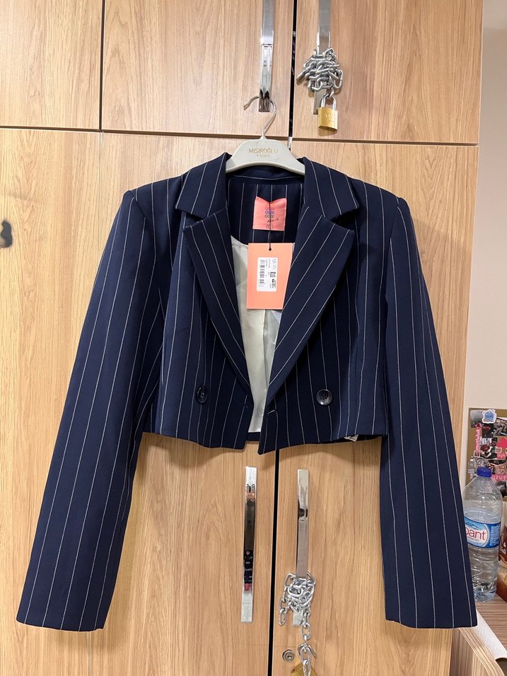 Lacivert Çizgili Düğmeli Kadın Blazer