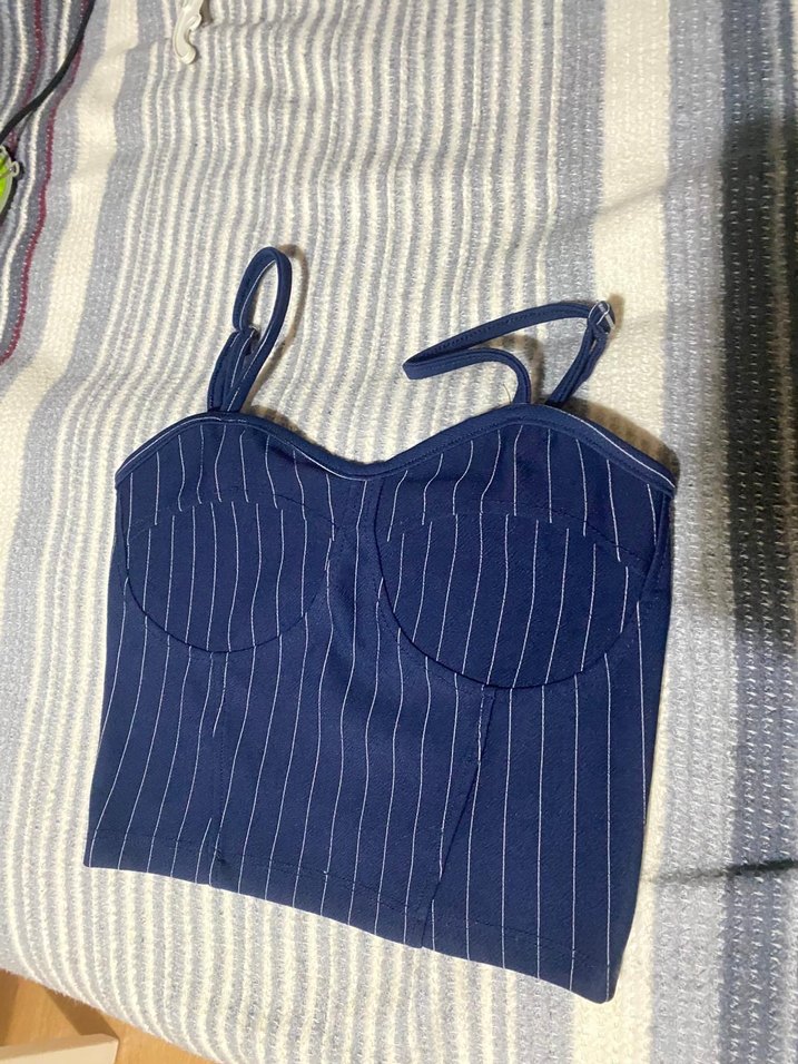 İnce askılı, lacivert bustiyer, sentetik kumaştan ve ince çizgili desende. Günlük kullanıma uygun, midi boy ve trend Paris sokak tarzı.