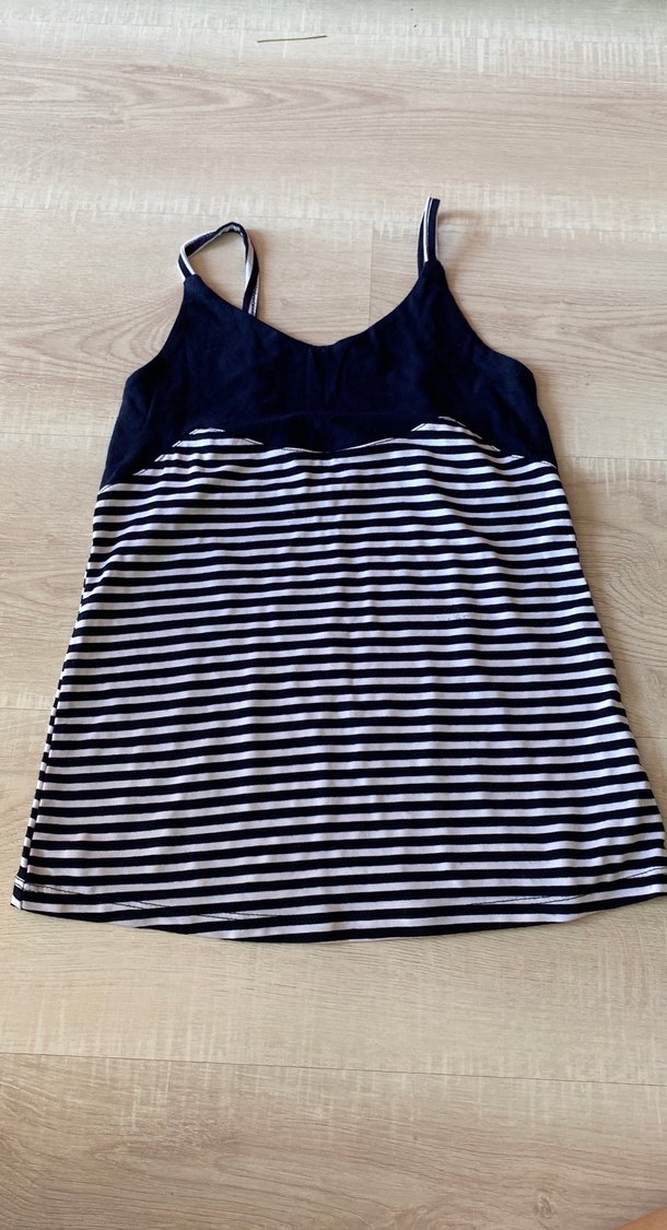 Lacivert çizgili, ince askılı, vücuda oturan kadın atlet. Yumuşak sentetik kumaştan, günlük kullanıma uygun rahat ve şık bir tasarım.