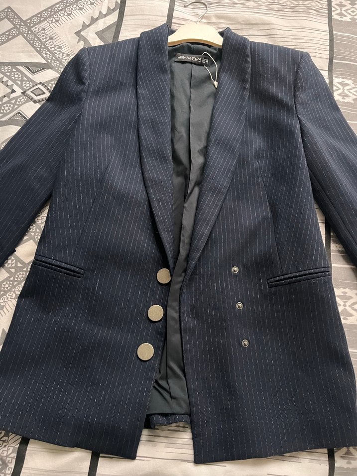 Lacivert, çizgili, düğmeli, normal boyda ve klasik kesim kadın blazer ceket. Ofis için uygun şık bir parça. ✨