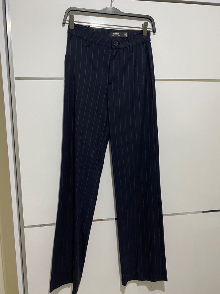 Lacivert çizgili, pile detaylı, regular fit uzun kadın kumaş pantolon. Ofis ve günlük şıklık için uygundur. 2 adet mevcut
