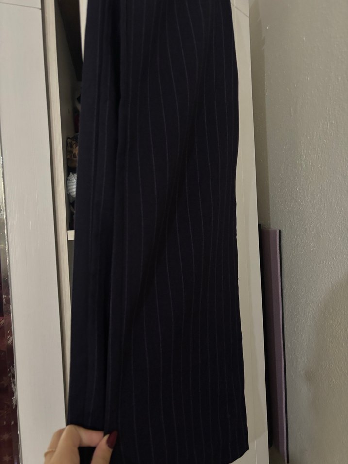 Lacivert çizgili, uzun paça ve regular fit kadın kumaş pantolon, yırtmaç detayıyla iş ve sokak stiline uygun.