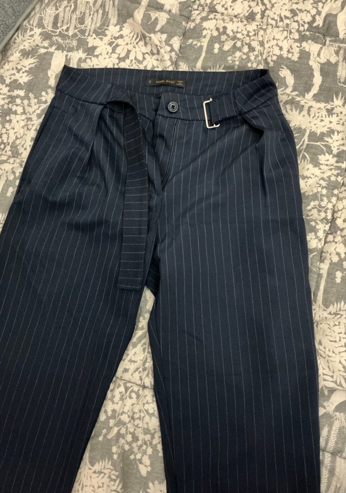 Lacivert çizgili, kemerli, normal boy midi kesim kadın kumaş pantolon. Denim kumaştan, iş ve günlük şıklık için uygundur.