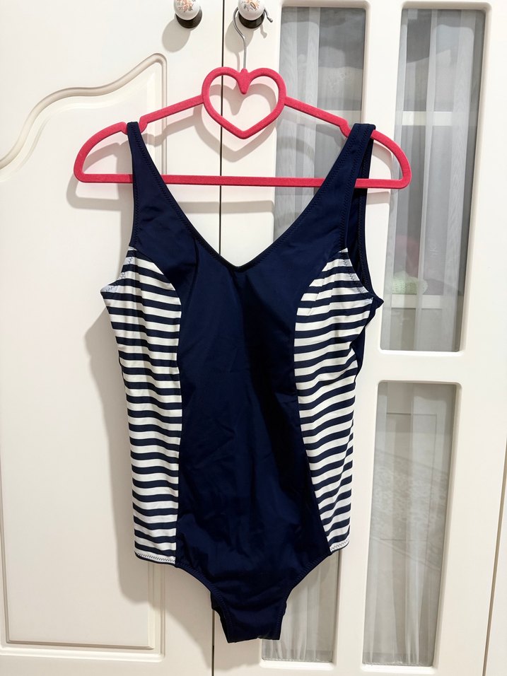 Lacivert ve çizgili yan panellere sahip, kolsuz ve vücuda oturan kadın mayo. Plajda rahat ve şık bir görünüm sunar. Sadece bir kez giydim.