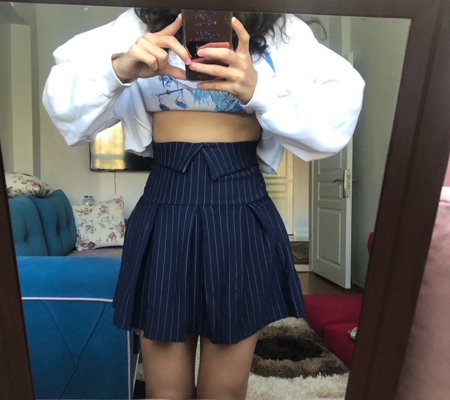 Lacivert çizgili ve pileli, dar bele oturtmalı kesim kadın mini etek, günlük kullanıma uygundur.