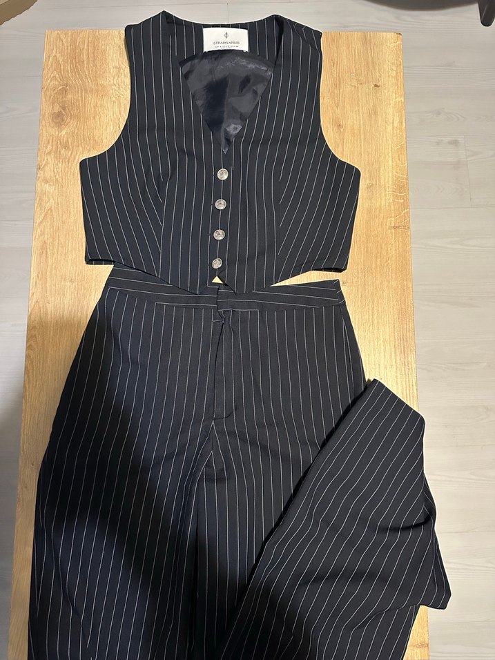 Düğmeli, kolsuz yelek ve uyumlu pantolondan oluşan çizgili kadın takımı. yaka ve regular fit kesimiyle ofis için uygun.
