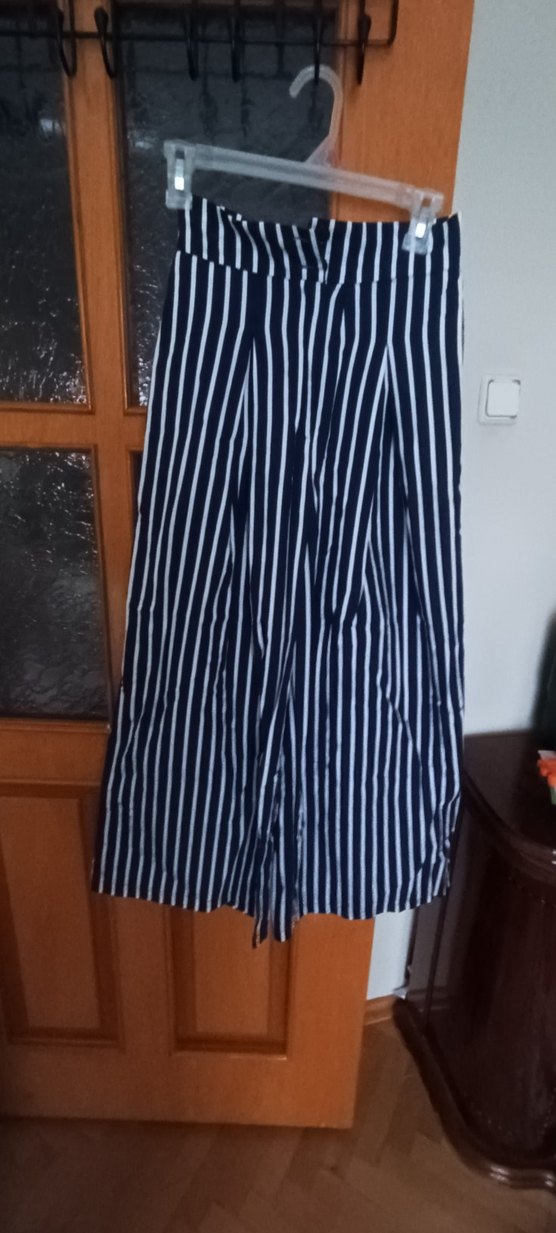 Lacivert uzun kadın kumaş pantolon, pilili ve çizgili desene sahip. Bol kesimiyle günlük kullanıma uygun, sokak modası tarzında. Sentetik kumaştan üretilmiş, Parisli tarzını yansıtıyor. yüksek bel defosu yoktur 38 beden