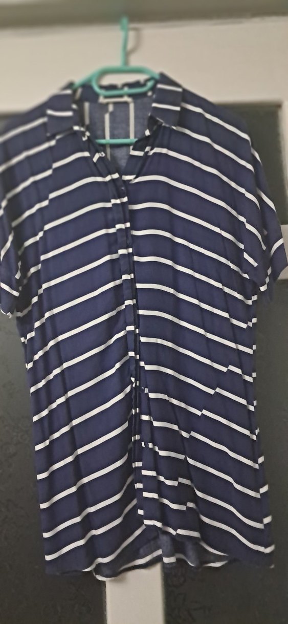 Lacivert ve gri çizgili, yakalı ve pilili kısa kollu pamuklu gömlek. Rahat kesimli ve midi boyda, günlük kullanım için uygundur.