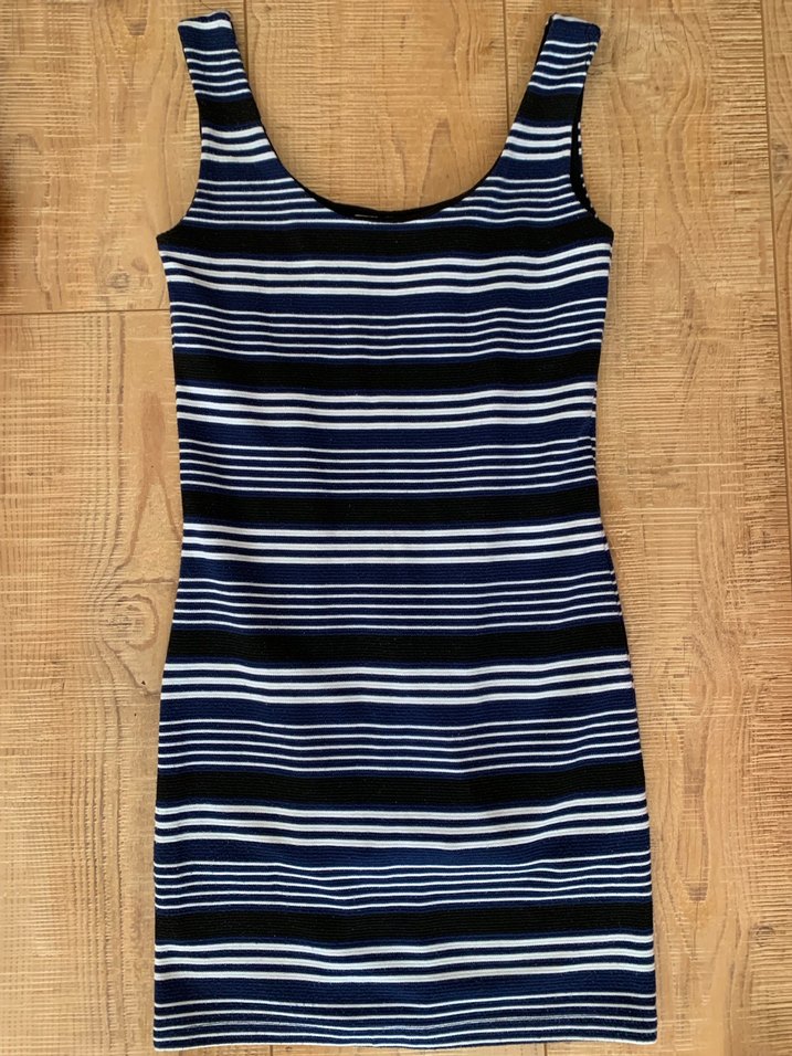 Kolsuz, lacivert çizgili midi elbise. Vücuda oturan kesim, kayık yaka ve pile detaylarıyla günlük sokak stiline uygun.