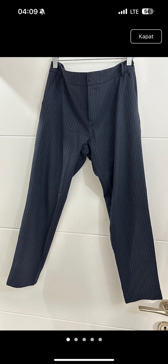 Stradivarius marka Lacivert çizgili, pile detaylı midi uzunlukta kumaş pantolon. Sentetik kumaştan, ofis ve iş ortamı için uygun, rahat kesim.38 beden