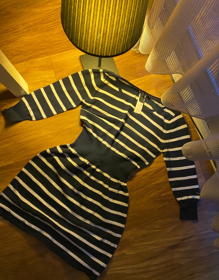 Uzun kollu, teknel yaka, kemerli, lacivert-beyaz çizgili, mini boy triko elbise. Trendy günlük sokak stiline uygun.