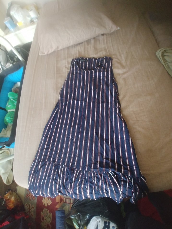 Lacivert çizgili, pilili ve bol kesim hamile uzun eteği, sentetik kumaştan rahat bir sokak stili sunar. Etek kısmında sökük var ufak dikip ya da terziye verip yaptırırsanız yeni gibi olur