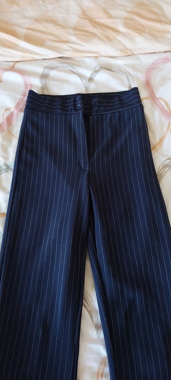Lacivert çizgili, pilili ve normal kesim kadın kumaş pantolon. Midi boyu, ofis ve günlük sokak stili için uygundur. Pürüzsüz sentetik kumaştan üretilmiştir. bir iki kez giyindim temiz