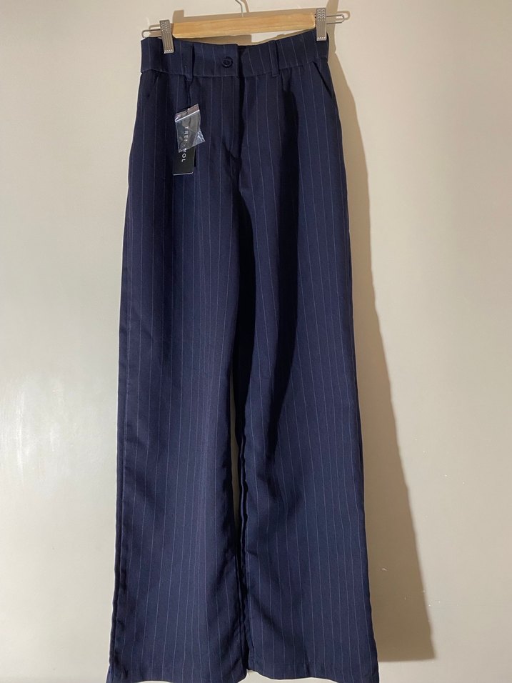 Lacivert çizgili, pilili, midi boy kadın kumaş pantolon. Sentetik kumaştan üretilmiştir, ofis ve günlük şıklık için uygundur.