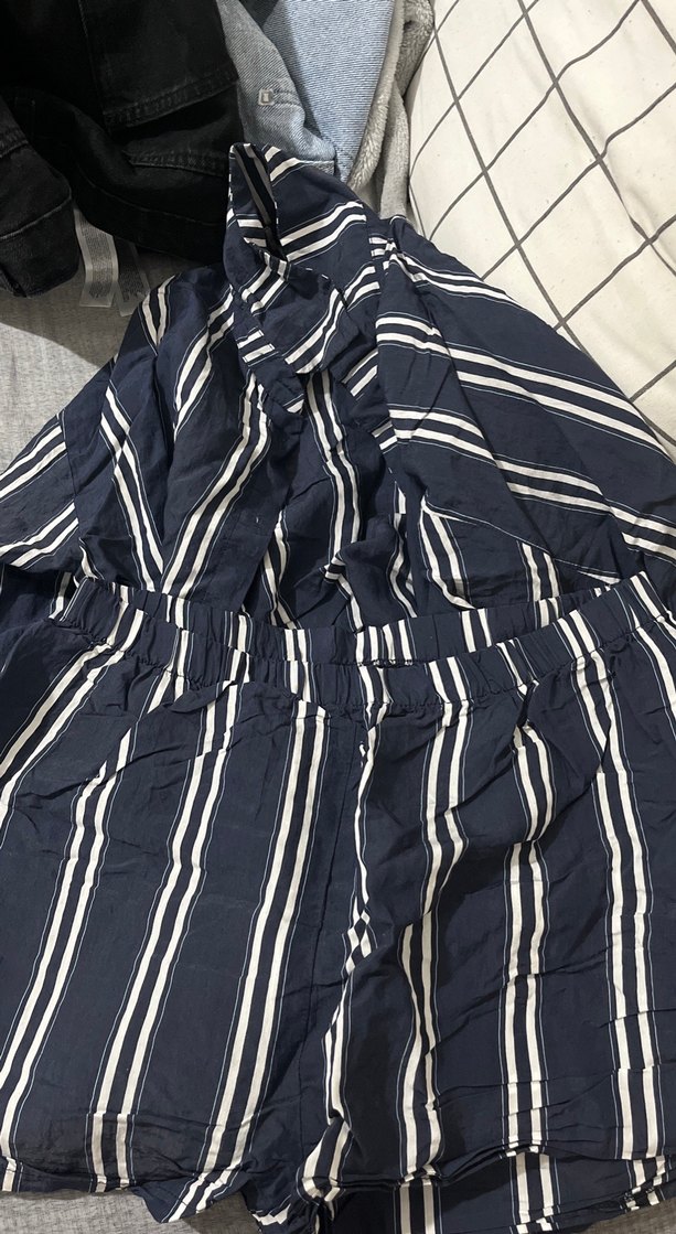 Lacivert çizgili, pilili ve keten kumaştan yapılmış, bol kesim ve uzun paçalı kadın pijama takımı.