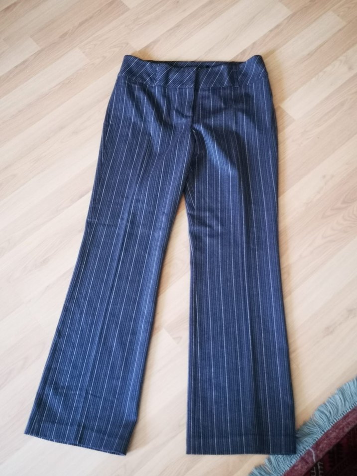 Lacivert ve gri çizgili, pilili midi uzunlukta denim kumaş pantolon. Ofis ve gündelik iş ortamları için uygun, regular fit kesim.