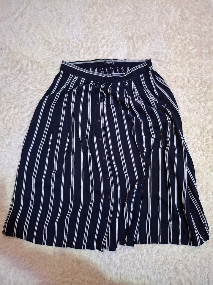 Lacivert renkte, beyaz çizgili, pilili ve bol kesim uzun etek. Sentetik kumaştan yapılmıştır, günlük ve sokak stiline uygundur. Colin's marka s beden