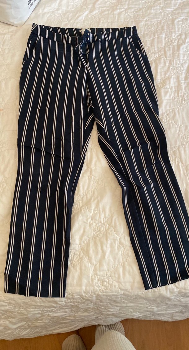 Lacivert çizgili, pliseli kadın kumaş pantolon. Normal boy midi kesim, rahat sokak stili için uygun. Sentetik kumaştan üretilmiştir.