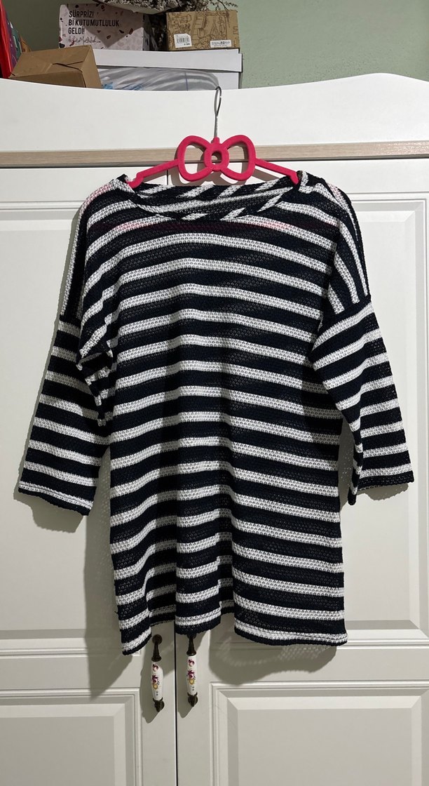 Lacivert çizgili triko, salaş kesim, uzun kollu ve tekne yaka tasarıma sahip, midi boyda ve yumuşak dokuda rahat bir üründür.
