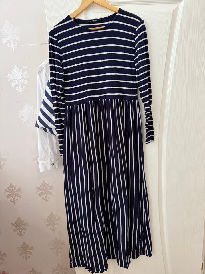 Uzun, bol kesim elbise, uzun kollu ve yuvarlak yaka. Pamuk kumaştan, pile detaylı ve lacivert çizgili desenli casual tarzda.