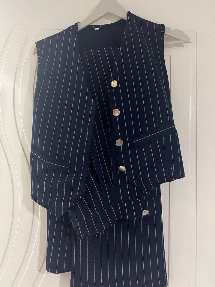 Lacivert renkli, çizgili ve uzun kesim kadın takım elbisesi. Düğmeli önde, kesik yakalı ve uzun kolludur. Ofis için uygun, normcore stilinde, sentetik kumaştan.