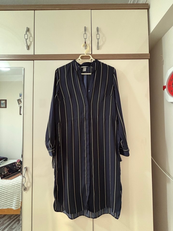 Lacivert renk, uzun kol ve notalı yaka detaylı kadın gömlek. Düzenli kesim, pliseli ve çizgili tasarıma sahip, ofis için uygun sentetik kumaştan yapılmıştır.