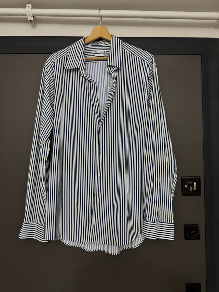 Lacivert çizgili, uzun kollu, yakalı ve düğmeli erkek gömleği. Ofis ve günlük kullanıma uygun, eşime almışım hiç giymedi etiketi kesildi yeni temiz defosuzdur